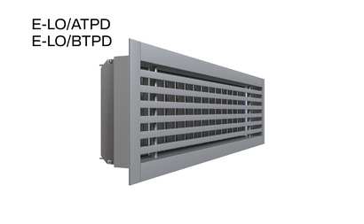 E-LO/BTPR: Rejilla de impulsión lineal de aletas fijas inclinadas a 20º con bstidor plano de 15 mm. y regulación de caudal. Añadiendo tramos puede suministrarse sin límite de longitud.