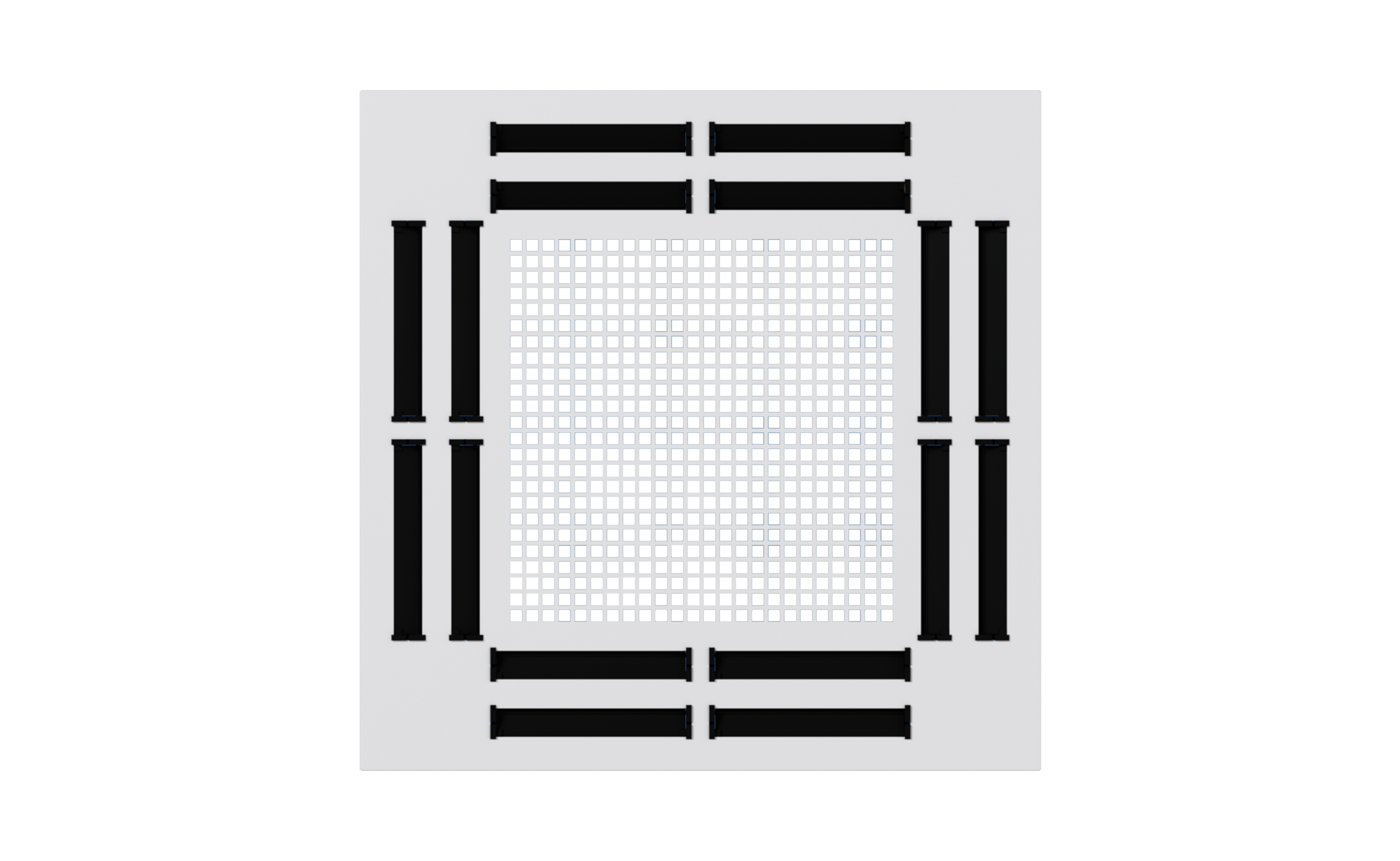 E-CASSEDRO Is a 593 x 593 diffuser. The perimeter has slots to throw the air in the 4 directions. In the midle there is the return grille. On this set there is a double plenum to connect air supply and air return ducts.